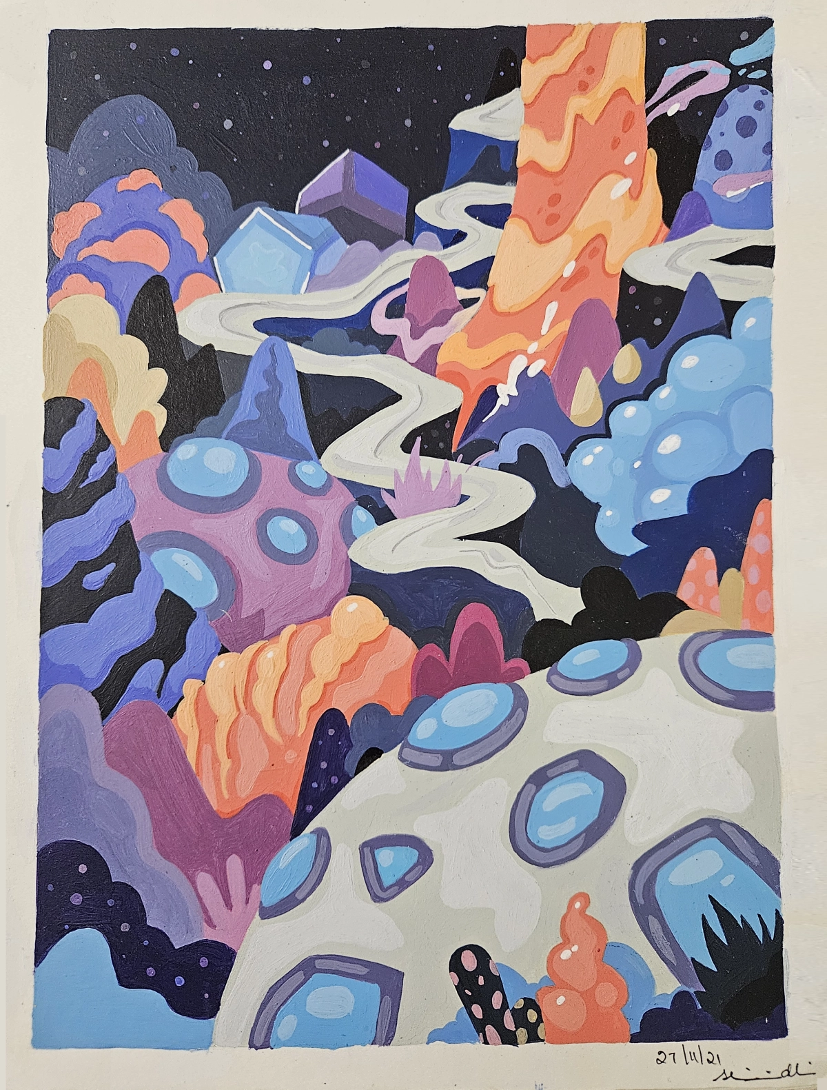 This painting is my vision of a world that feels magical and unknown. I wanted to create a place that looks different from our reality—full of strange shapes, glowing colors, and a winding path that invites you to explore.