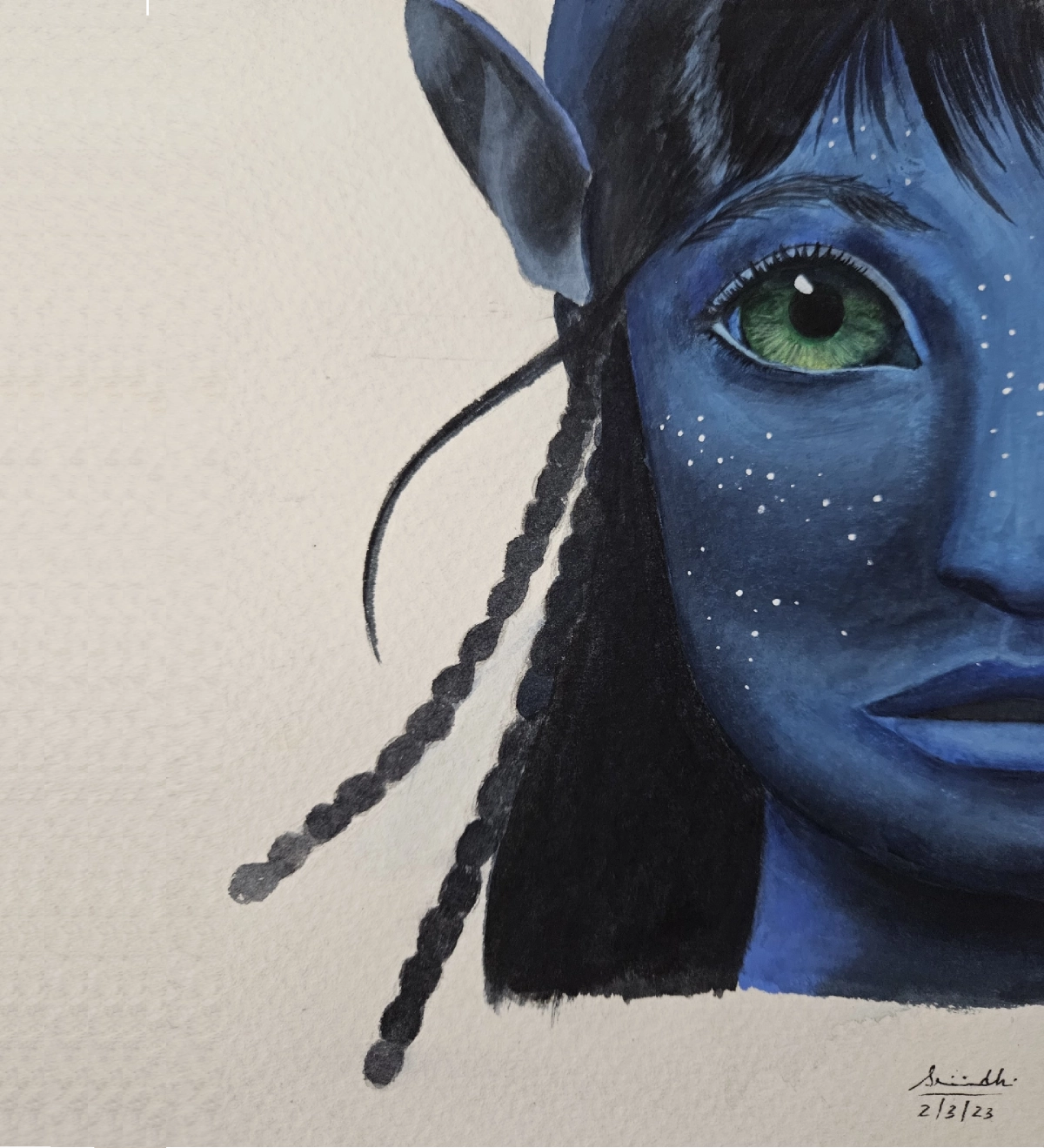 This painting, made with gouache on paper, shows a close-up of a blue-skinned character with a bright green eye. The detailed braids, glowing white freckles, and deep shadows bring life to the artwork. The way the face is shown only halfway makes it feel mysterious, as if the character is looking at something important beyond the frame.