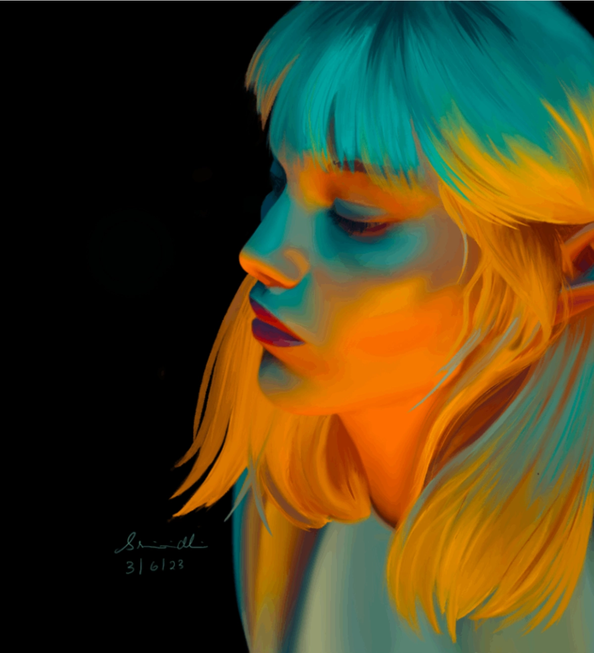 The artist might be trying to show a connection with nature, a different world, or a unique identity. The use of blue tones and soft lighting gives a calm yet powerful feeling. It could also represent curiosity, strength, or the beauty of something unfamiliar.