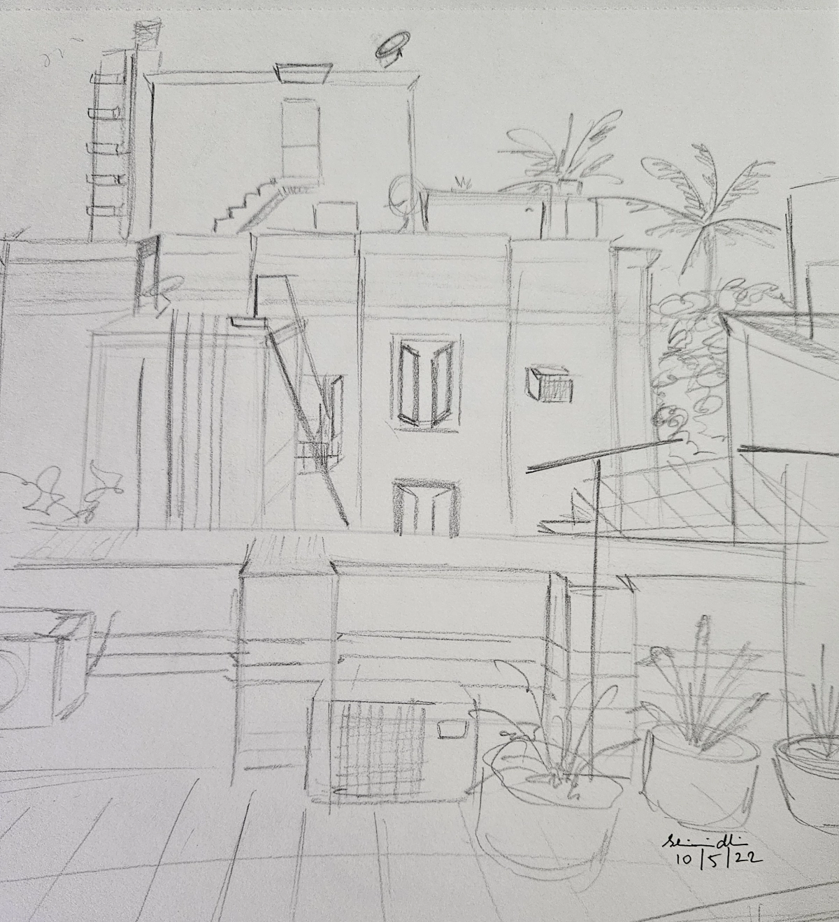 It seems to tell the story of city life—how people use rooftops not just as part of their homes but as spaces to relax, enjoy the open air, or connect with their surroundings. The light and freehand style of the sketch makes it feel natural, as if the artist quickly captured a moment of quiet beauty in a busy city.