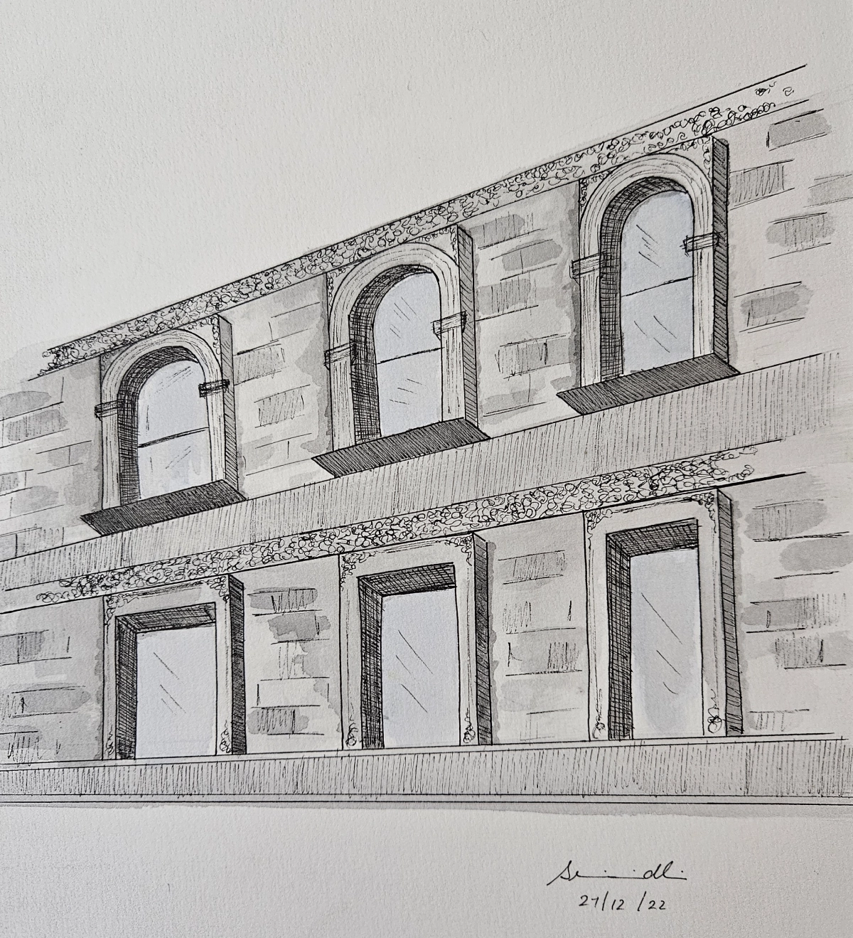 This artwork beautifully captures the charm of an old architectural structure. The artist has used fine pen lines to highlight the details of the building, such as its arched windows and decorative patterns, while the soft watercolor shading adds depth and realism.