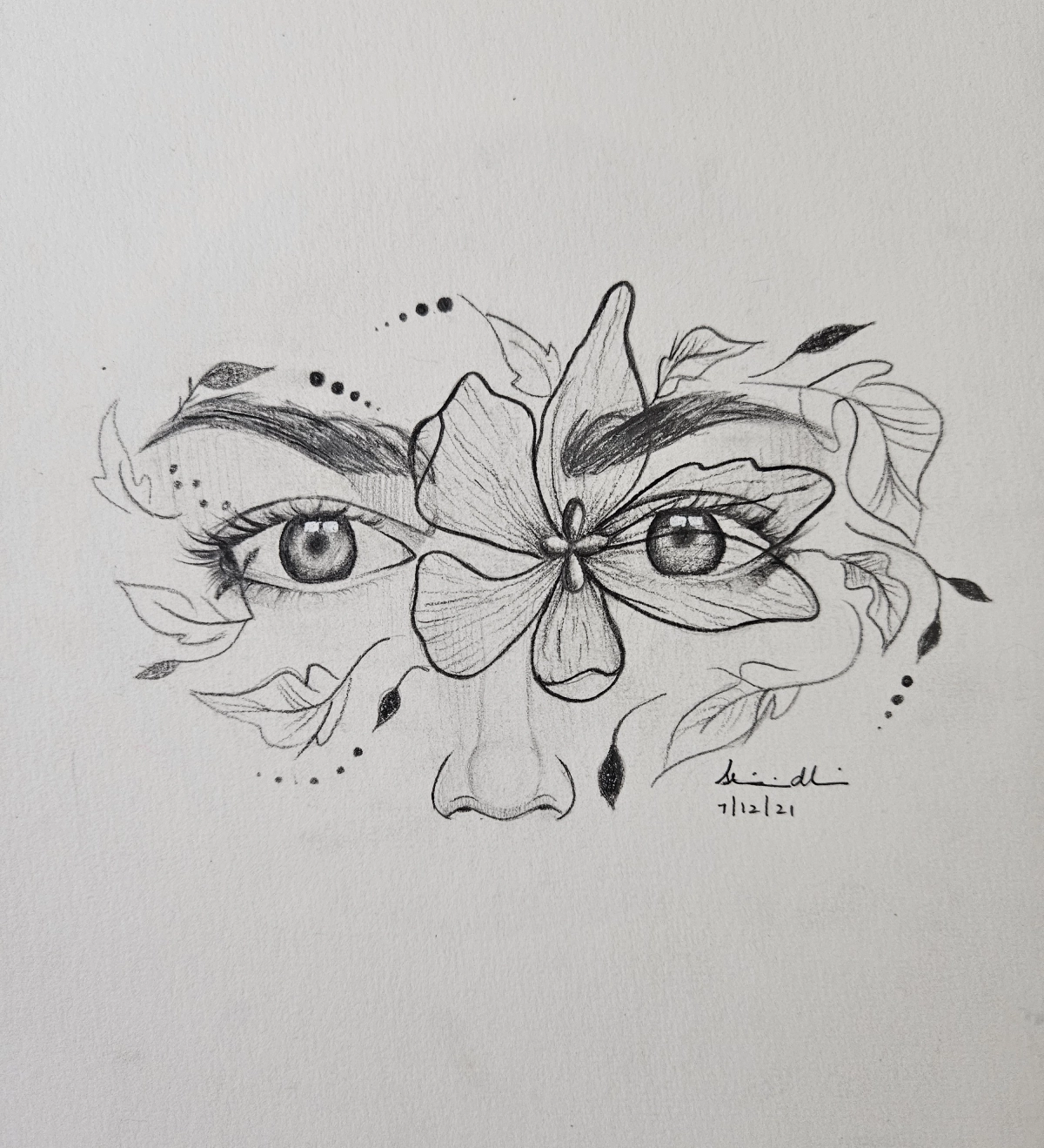 This pencil drawing shows a pair of deep, expressive eyes surrounded by delicate flowers and leaves. The way the petals blend with the face gives it a dreamy and artistic feel.