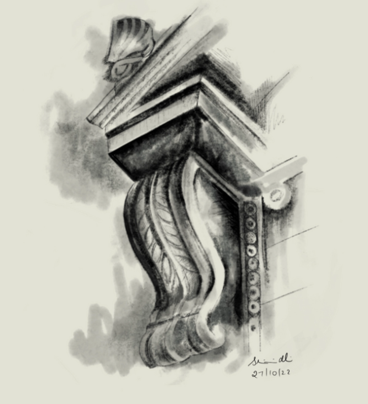 This graphic sketch shows a beautifully carved architectural detail. The curves and patterns in the design reflect old, classic craftsmanship. The shading adds depth, making it look realistic and giving it a strong, timeless feel.