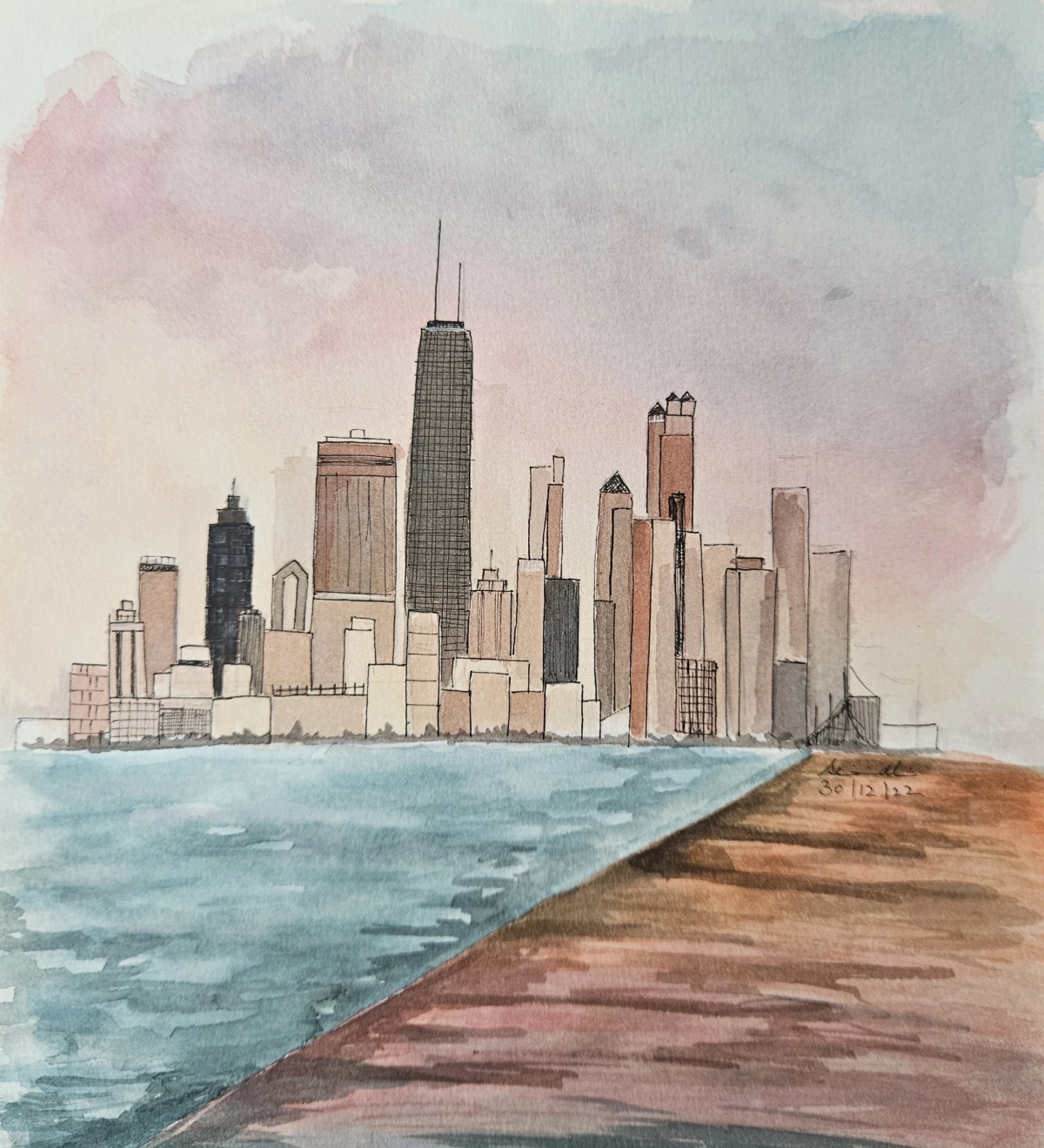 This watercolor painting captures the essence of a city skyline by the water, blending soft pastel shades in the sky with intricate architectural details. The contrast between the deep blue water and the warm, earthy pathway adds depth, almost guiding the viewer into the scene.