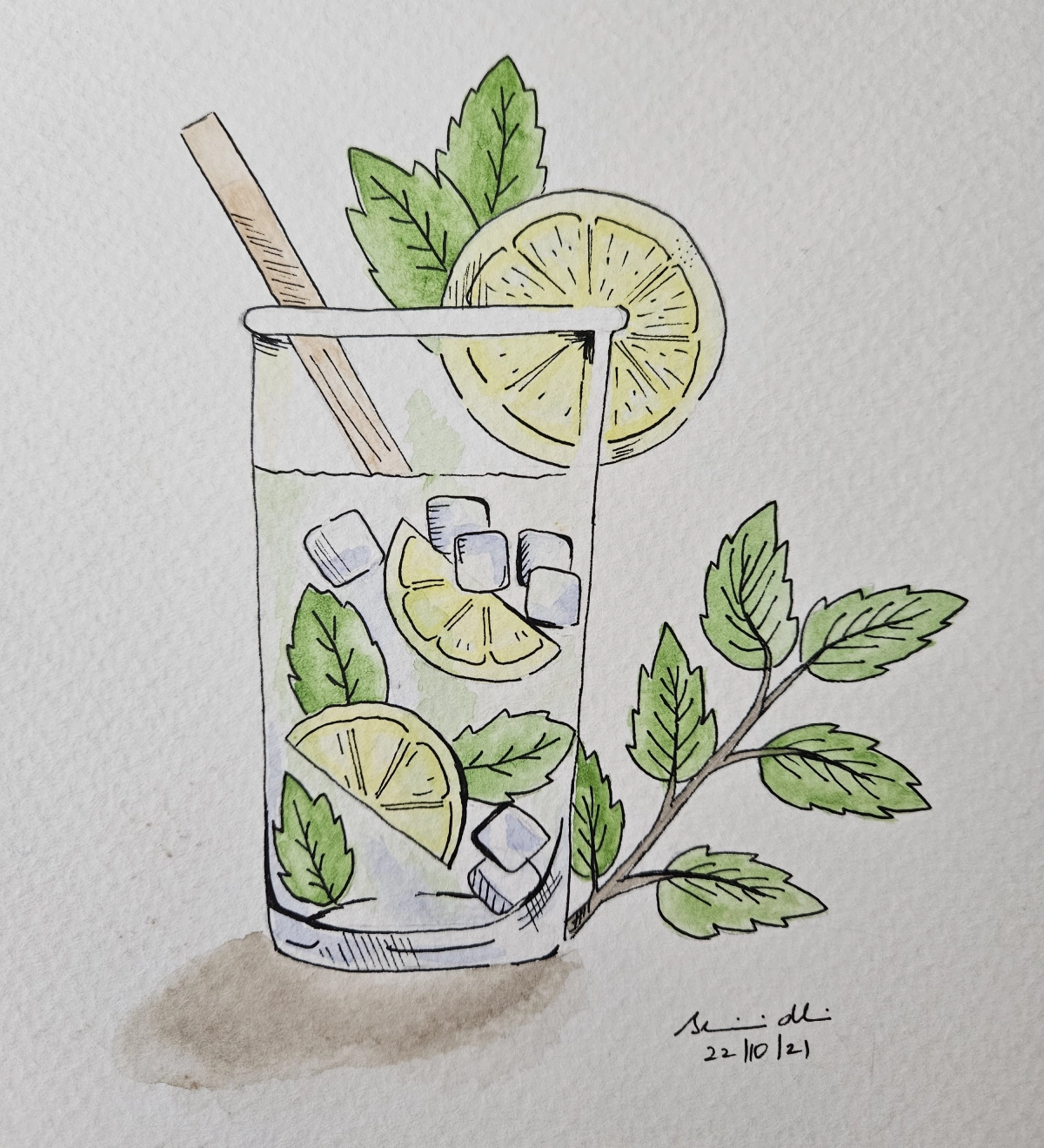 Through this painting, I wanted to bring out a sense of freshness and simplicity—something that feels natural and energizing. The mix of soft watercolor and fine ink lines adds a light, airy touch. The date in the corner is a little reminder of when I painted it, making it a small memory of that moment.
