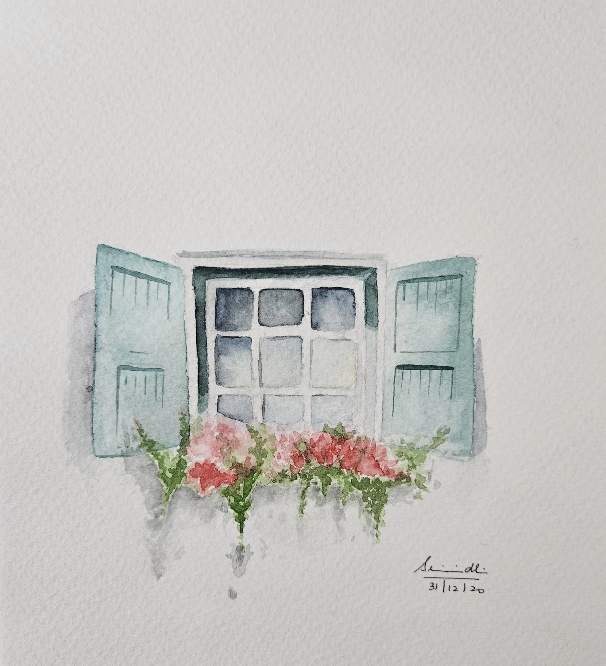 This watercolor painting captures the simple beauty of an open window with soft green shutters and vibrant pink flowers spilling over the edge. I wanted to create a feeling of calmness and warmth, as if a gentle breeze is passing through, bringing in fresh air and sunlight.