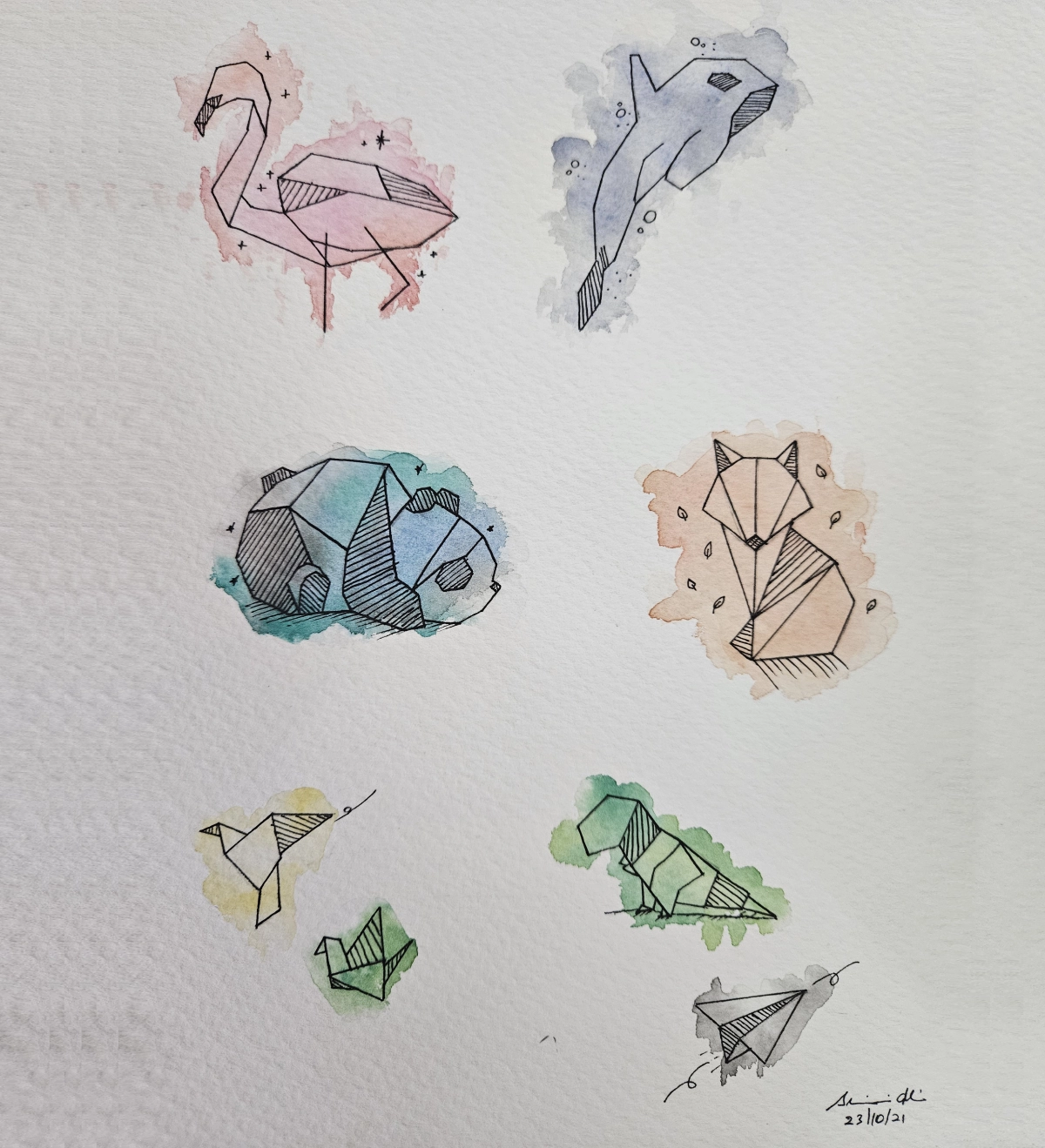 This watercolor painting on paper is a collection of different animals, drawn in a geometric style with fine ink lines. I used soft watercolor splashes behind each one to give them a light, playful feel. The flamingo, shark, fox, panda, and other small creatures each have their own unique charm, brought to life with simple shapes and colors.
